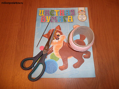 Для изготовления цветов, поделки из бумаги и пряжи нам понадобится пряжа и крючок. Приготовим двухстороннюю зеленую бумагу и ножницы, не забыв о нитках и ножницах.