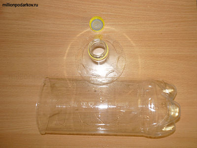 Снимаем с бутылки крышку. Затем отрезаем от бутылки горлышко. Из горлышка мы будем делать подставку для вазы, а основная часть бутылки будет вазой.