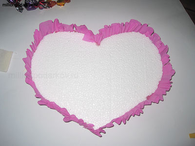 Из пенопласта вырежьте сердце и с помощью клеевого пистолета оформите край бумагой.