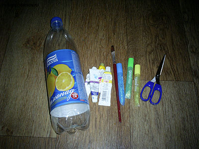 Для того чтобы сделать расписную фоторамку Вам пригодятся такие материалы как  пластиковая бутылка, ножницы, клей с глиттером, акриловые краски, кисточка.