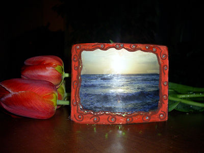 Теперь акриловыми красками раскрашиваем рамку. В данном случае мы обвели по ее контуру красной краской, коричневым цветом выделили фон и нарисовали завитки. Клеем с глиттером выделили по контуру и добавили по капельке на рисунок. Вот так и начинается вторая жизнь пластиковых бутылок, которые превращаются в достойный и практичный декор для дома.