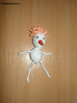 Продеваем с помощью крючка оранжевые нитки, и закрепляем их узелками на голове, - это будут волосы. Затем таким же образом делаем ручки и ножки.